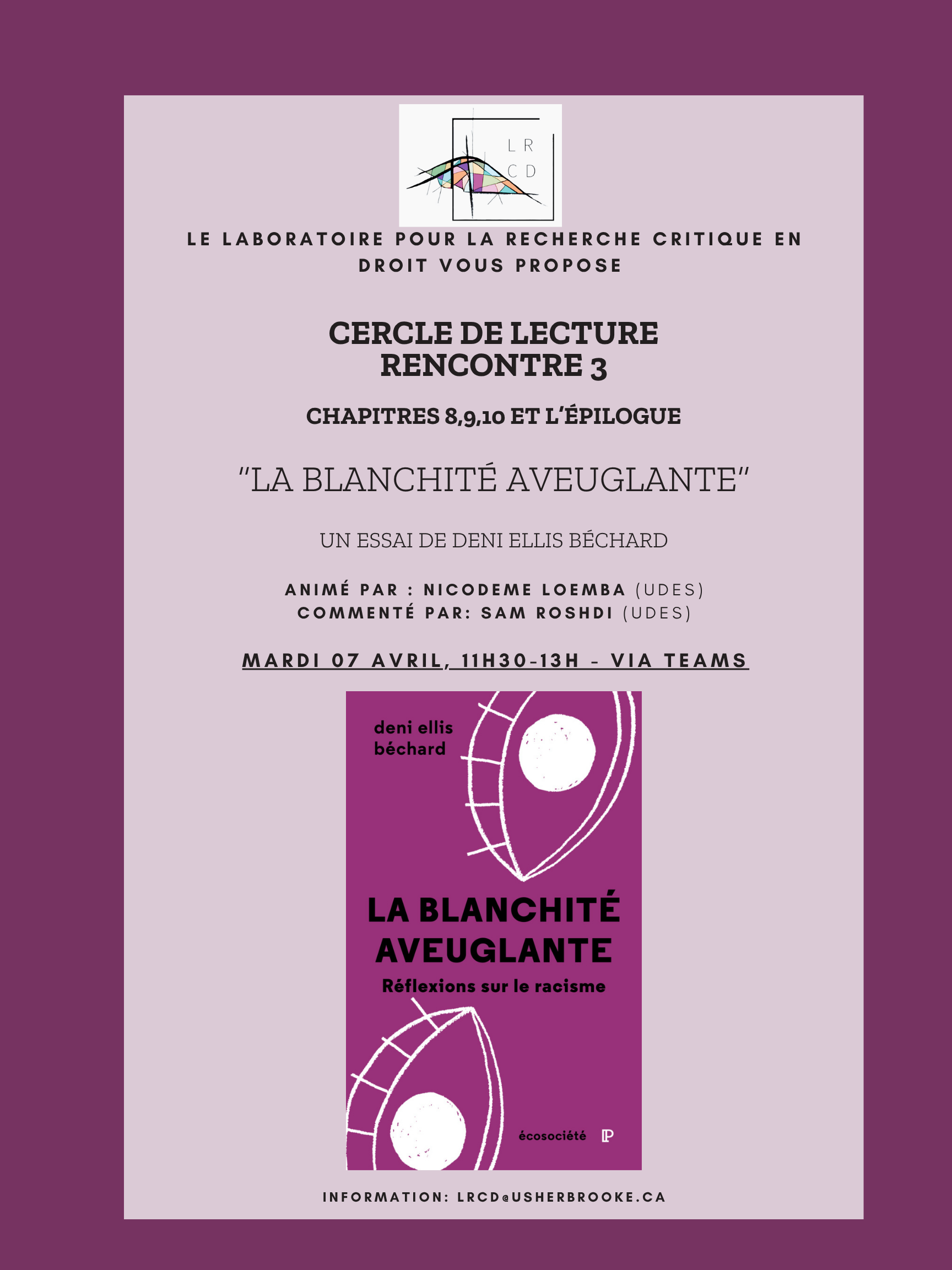 Pour la quatrième rencontre, l’autrice sera présente pour répondre aux questions et commentaires des participants.